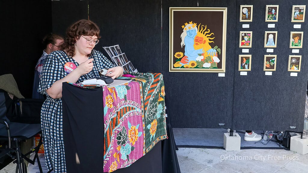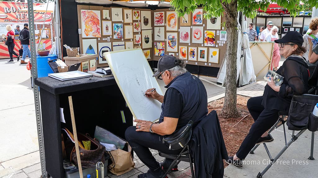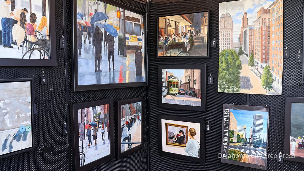 Among the featured artists is Tate Hamilton, a Denver-based oil painter known for his vibrant urban streetscapes, using a consistent five-color palette to capture the rhythm of urban life. His piece “Heart of the City,” depicting Downtown OKC, was selected as the 2025 Festival’s official image and appears on this year’s poster. While chatting with guests, Hamilton pointed out nearby landmarks in the painting, including the Downtown OKC Library and The Oklahoma Tower.