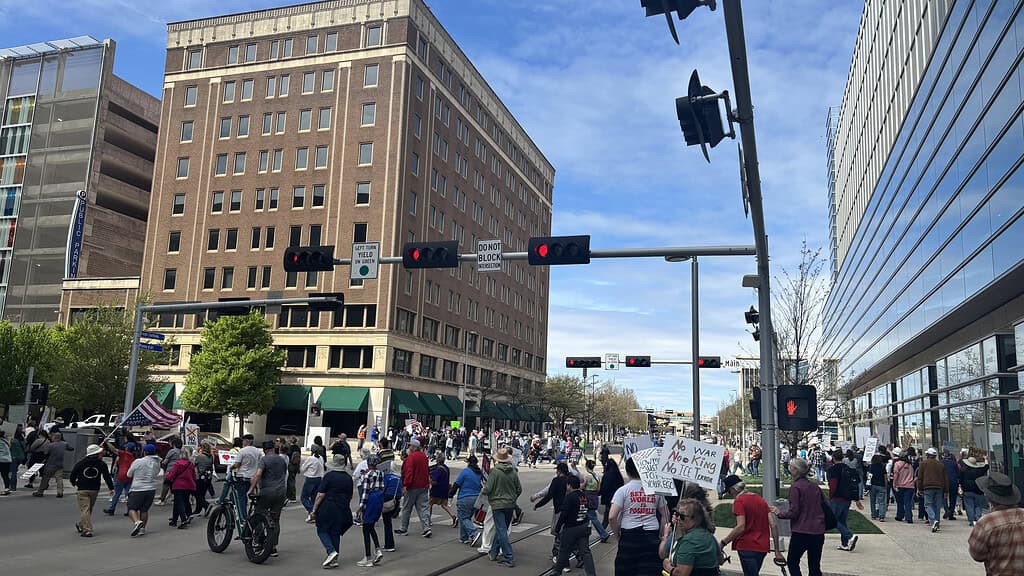 OKLAHOMA CITY – Thousands gathered in OKC’s Bicentennial Park Saturday afternoon for the third installment of the ongoing “No Kings” protest movement, with activists rallying and marching in broad opposition to Trump administration policy, from immigration enforcement to the war in Iran.