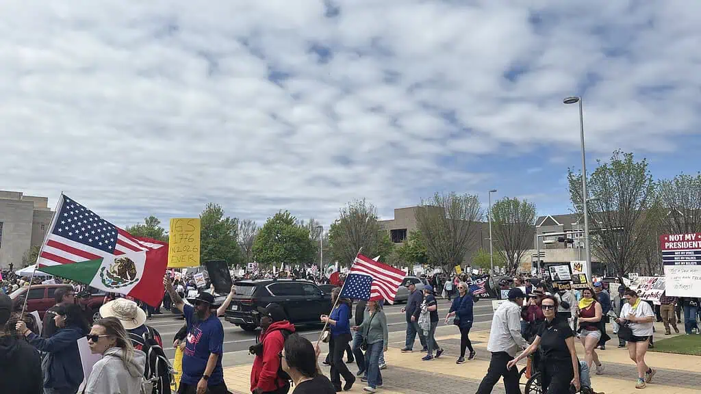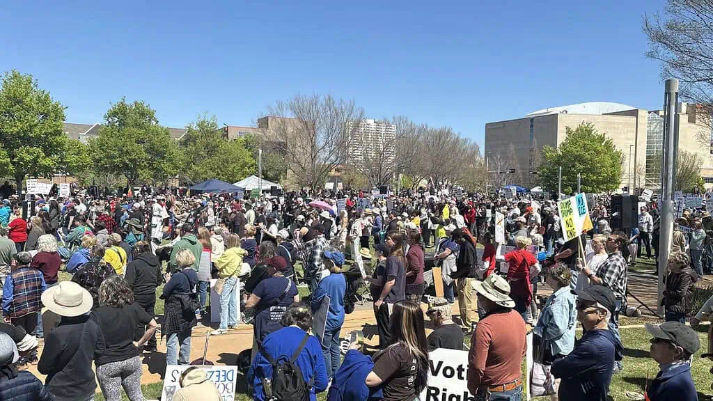 OKLAHOMA CITY – Thousands gathered in OKC’s Bicentennial Park Saturday afternoon for the third installment of the ongoing “No Kings” protest movement, with activists rallying and marching in broad opposition to Trump administration policy, from immigration enforcement to the war in Iran.