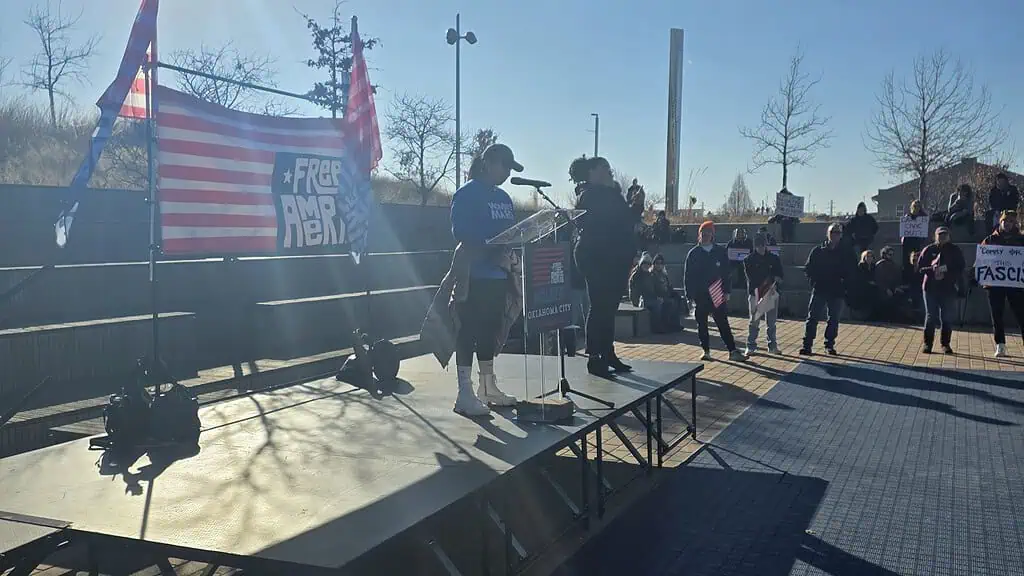 OKLAHOMA CITY – Members of the Oklahoma City community joined nationwide protests Tuesday and “walked out” from their jobs and other obligations to attend the “Free America” march from Bricktown Ballpark to Scissortail Park on the one-year anniversary of President Trump’s Second Inauguration.