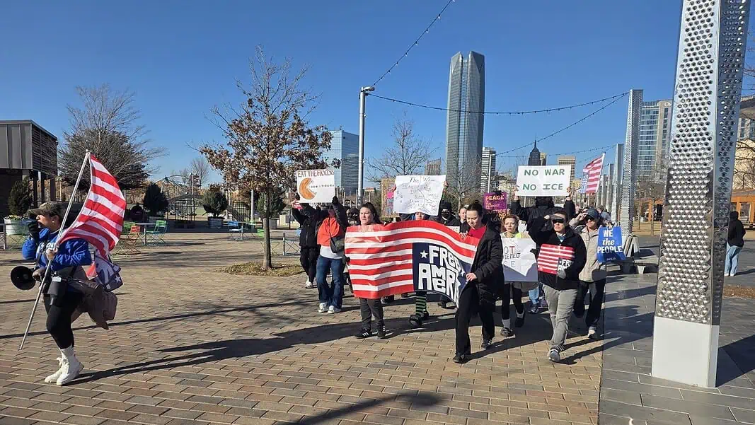 OKLAHOMA CITY – Members of the Oklahoma City community joined nationwide protests Tuesday and “walked out” from their jobs and other obligations to attend the “Free America” march from Bricktown Ballpark to Scissortail Park on the one-year anniversary of President Trump’s Second Inauguration.