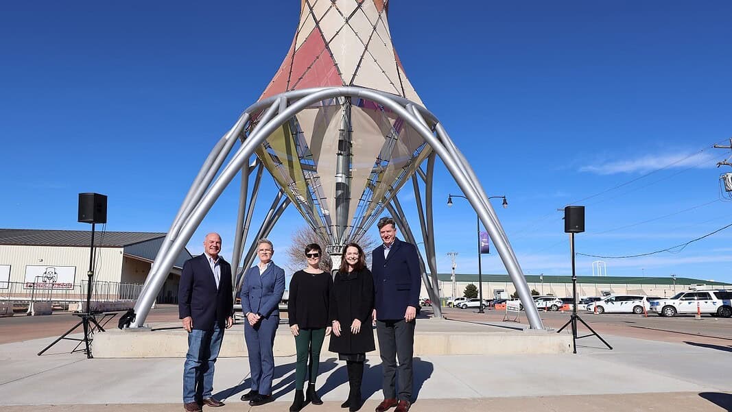 A 72-foot landmark sculpture, “Bolt Tower,” that includes a 3D-printed time capsule filled with people’s photos and memories of the State Fair, was dedicated today at OKC Fair Park.