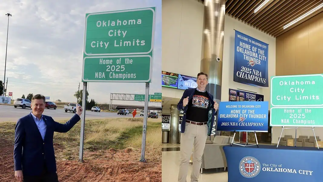 On Thunder Day, Oklahoma City Mayor David Holt is commemorating the Oklahoma City Thunder’s 2025 NBA Championship with new signage inside and outside of OKC Will Rogers International Airport, as well as entrance signs at I-35, I-40 and I-44.