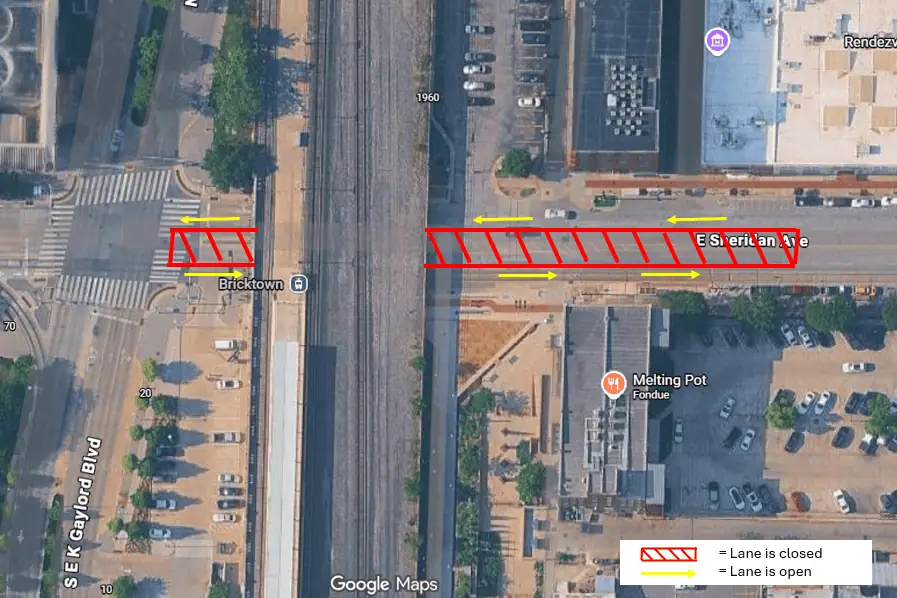 - Two westbound lanes and one eastbound lane on Sheridan will be closed, as well as one westbound lane on Reno.