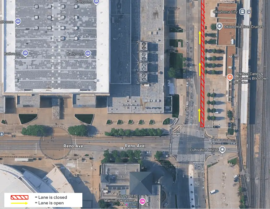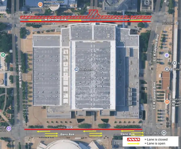 - The northbound lane on the east side of E.K. Gaylord, between Reno Ave to Sheridan Ave., will be temporarily closed for utility work.