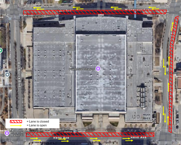 - The two westbound lanes of Reno Avenue from South E.K. Gaylord to Thunder Drive/Robinson Avenue will be closed.