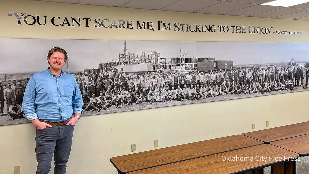 Forrest Bennett, incoming president of the Oklahoma AFL-CIO, stands in front of the Oklahoma Labor Hall of Fame in the headquarters in OKC in Nov. 2025 (BRETT.DICKERSON/Okla City Free Press)